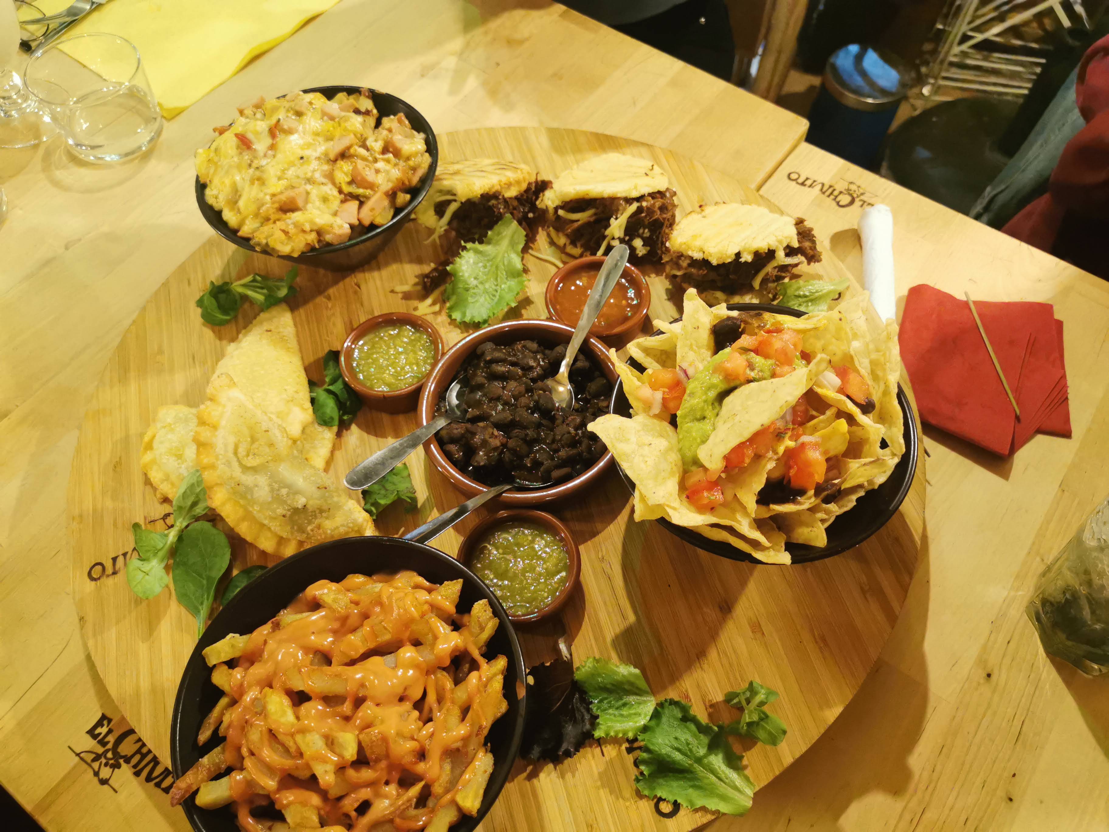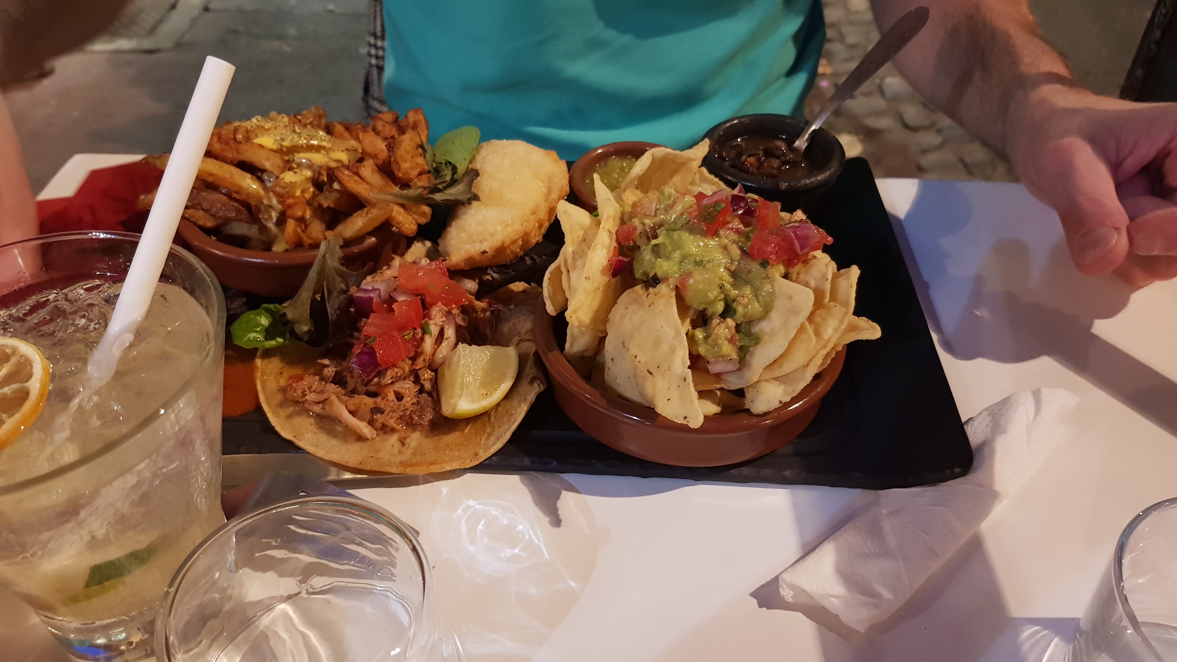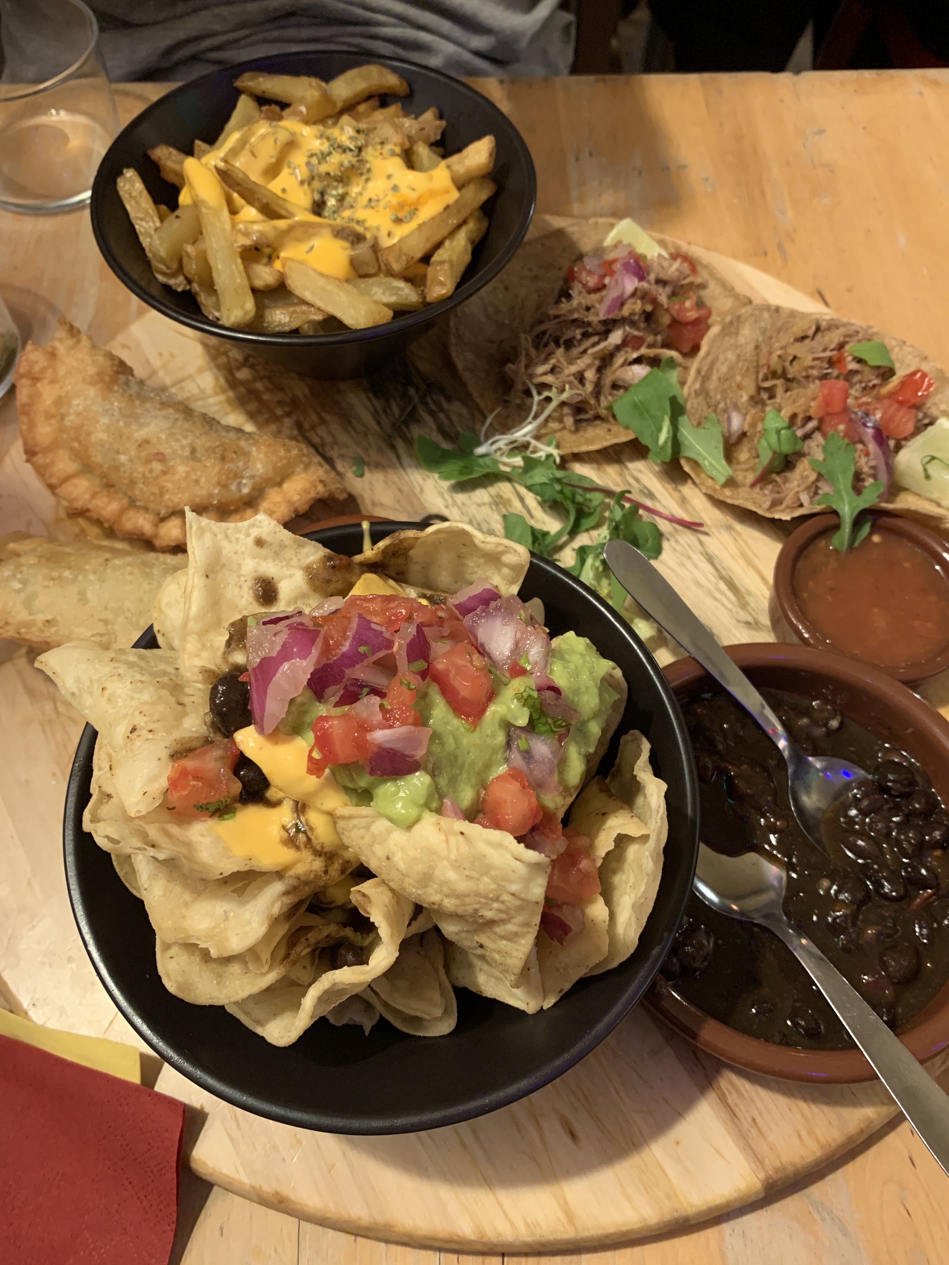 On a commandé à emporter :Un menu dégustation et une assiette empanadas. Des frites très molles, des empanadas pas bien garni, salade vieille, peu de guacamole et portions ridicules de pico de gallo et de haricots... très déçue. La viande est bonne dans le nacho. C’est tout! Trop cher pour la quantité et la qualité.