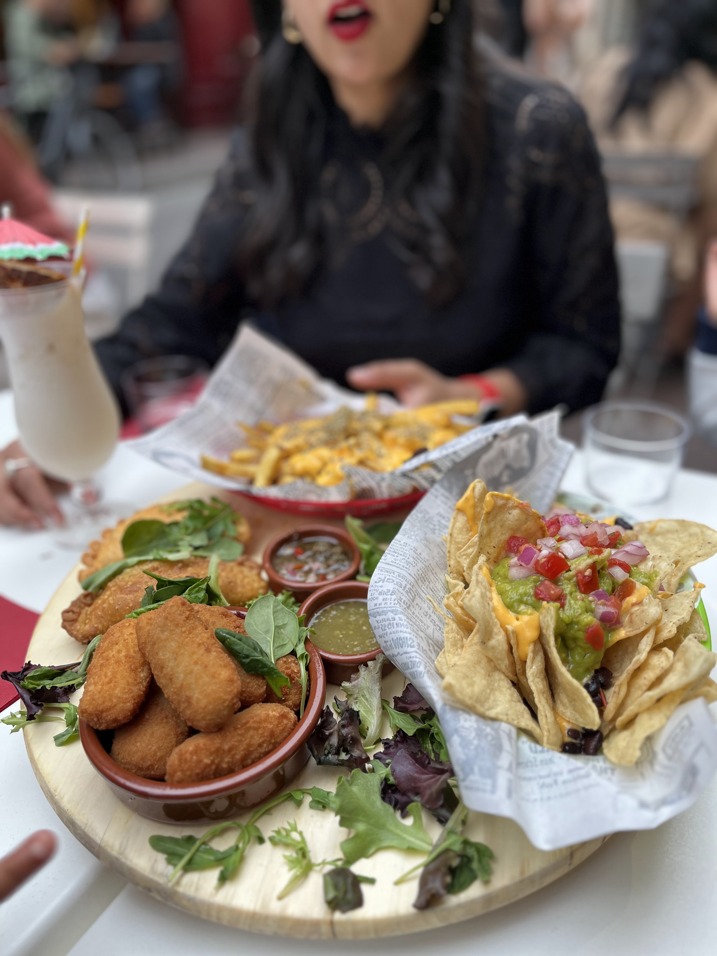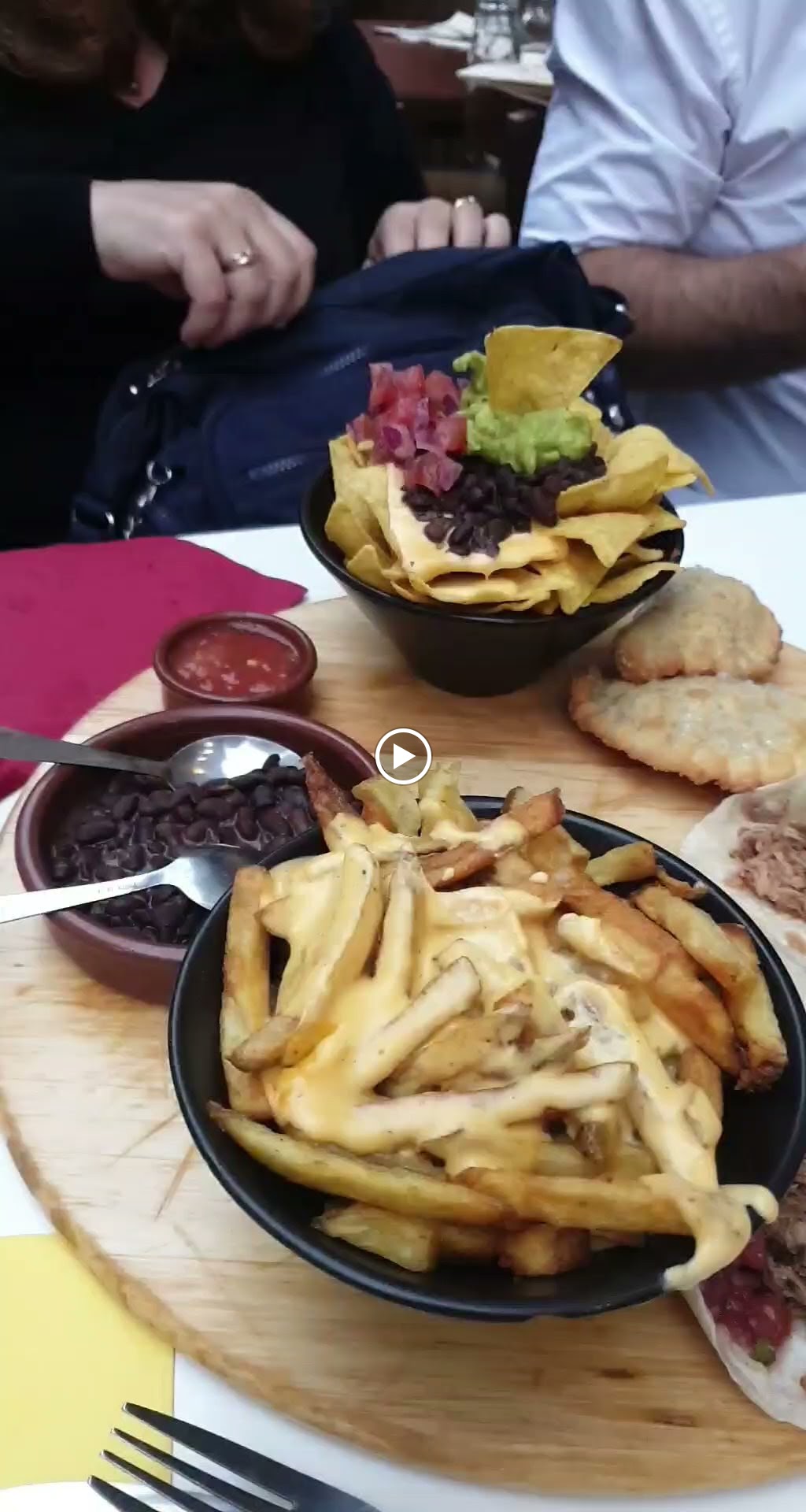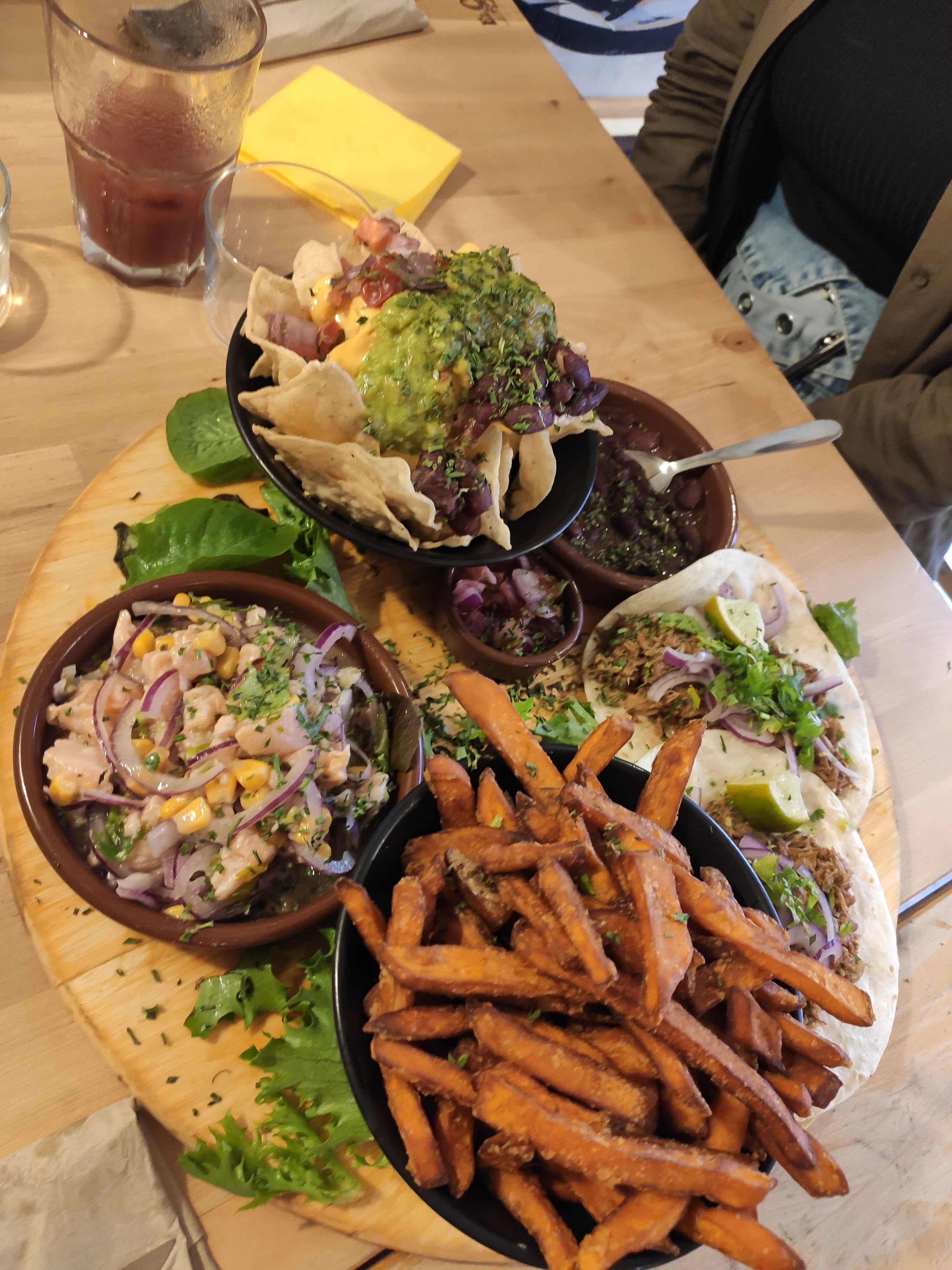 Nous sommes venus à deux un samedi soir sans avoir réservé. Malgré le fait que les tables étaient toutes réservées et qu'il y avait du monde, les serveuses nous ont trouvé une petite table à l'intérieur. Nous avons été surpris par la quantité de nourriture et avons calé sur la fin... Les serveuses sont très agréables et il y a une bonne ambiance ! Les plats servis sont beaux avant d'être bons et mettent l'eau à la bouche ! Quelques petits bémols cependant : le prix nous a semble au premier abord un peu élevé, malgré la quantité de nourriture. De plus, les options végétariennes ne sont pas exceptionnelles et mériteraient d'être sur la lancée du reste: SAVOUREUSES et COLORÉES, car bon, fromage et maïs c'est très basique et fade. Enfin, il sais faisait très chaud dans la salle et avec le bruit ça devenait vite étouffant.